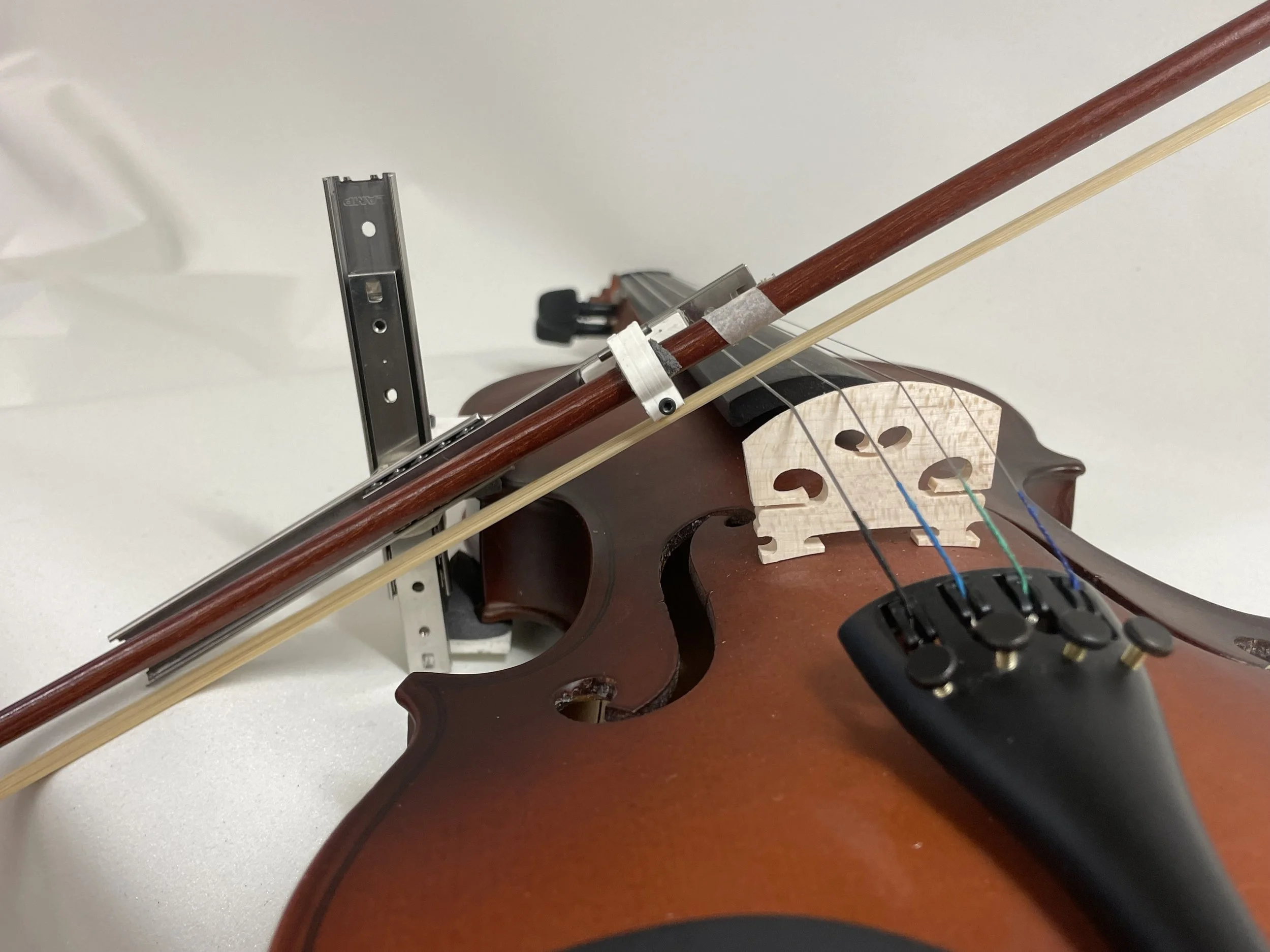 Using a dual-rail system, the bow can effortlessly slide back in forth and play all four strings